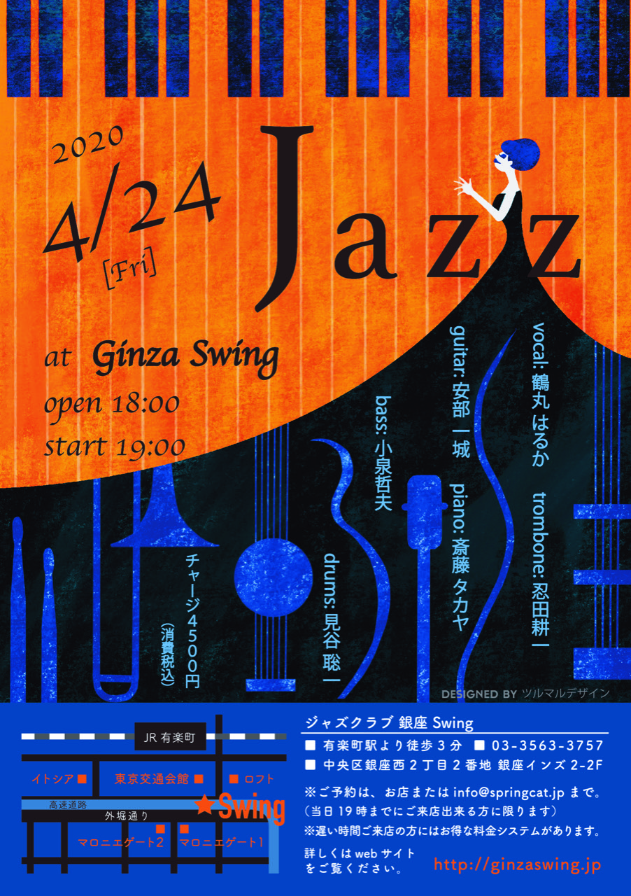 ・鶴丸はるか(vo) 安部一城(g) 忍田耕一(tb) 斎藤タカヤ(pf) 小泉哲夫(b) 見谷聡一(dr)